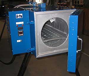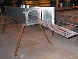 Project Background:A manufacturer of interior architectural panels contacted us seeking a custom industrialtunnel oven for preheating a newly designed product. The panel was made of a special polymer material that became pliable at a temperature of 300F- 400F. The selling concept of the product was that it could be shaped into a variety of forms and shapes to accommodate different types of interior structural spaces. The length of the product presented preheating challenges because the industrial oven required had to be 100" long, and had to open on both ends to facilitate placement of the part inside the oven and removal. For this particular application we designed a custom industrial preheating oven and called it the "Tunnel Oven". This preheat oven had to be unique and completely custom for the product so that client's product design objectives could be met. The first challenge we encountered with designing the oven was the length, and how the part was to be loaded into the oven. We designed a long, perforated steel tray that could slight out from the oven when pulled, enabling the part to be loaded on the tray then pushed into the oven for heating. The perforations allowed the heat to permeate the oven and surround the part evenly. The center of the oven had to be strengthened to prevent sag in the middle and buckling. This custom oven is useful for a variety of purposes. The temperature range can be modified for any application. A programmable digital controller was installed for this oven so the temperature reading would remain very accurate and the temperature control could be adjusted for different applications. Industrial Tunnel Oven Specifications:Part Number: #010310 Industrial Tunnel Oven Construction ExteriorThe industrial tunnel oven is a heat treating oven constructed of carbon steel throughout. The oven exterior has a highly durable, powder-coat finish in blue that is resistant to scratching and corrosion. This a front and rear-loading, floor-positioned preheating oven and is designed to be stored on a floor for ease of access to the parts being preheated. Perforated, removable shelving was installed on this batch oven to evenly distribute the heat around the part to be preheated. The lid hinges are tack-welded to ensure smooth operation for many years. The control panel which houses the digital PID is mounted on the side of the oven with heavy-duty rivets. A standard "ON/OFF" indicating light was also provided, which is bright enough to be seen from a distance. A variety of temperature control methods are available. The Tunnel Oven preheating oven rests on tack welded steel legs in the front and back to provide stability for the oven. InteriorThe interior of the Tunnel Oven is unique and features a custom-designed extendable shelving system. The interior is cylindrical for the entire length of the oven and can be used for a variety of applications. The elements are installed at the bottom of the oven which allows the heat to radiate around the oven. The heating elements are housed in element guards to protect users from coming in contact to the elements. The interior of the K-TL30 preheating oven is painted with a reflective, galvanized paint and the interior welds are touched up with high-temperature aluminum paint. All our preheating ovens are made in the USA and feature a 1-year limited manufacturer's warranty. Parts are readily available.