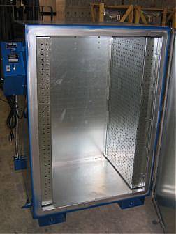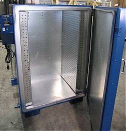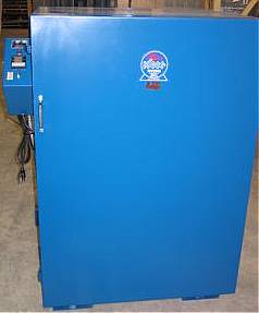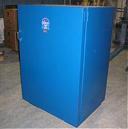 Project Background:Firestone Polymers supplies synthetic rubber, thermoplastic elastomers and impact modifiers to rubber, plastics, adhesive and asphalt markets around the world.The engineers had a specific preheating application that was required for very long, tightly-woven cotton filters used in their manufacturing processes. The filters had to be kept perfectly dry before use so that they functioned properly. A custom preheat oven was requested that could allow the 12" diameter filters to stand upright in the oven cavity and be heated to a specific temperature range of 140-150F. The heating elements had to be located on the sides of the oven beneath perforated steel covers so that the filters did not come in direct contact with the heating elements. Even though the temperature range was not very high, the part was very delicate and could not be damaged in any way. The filters were positioned on the inside base of the preheating oven and extended upwards. For this particular application we designed a custom industrial oven from scratch and called it the K-FSU (FSU for Filter Storage Unit). This preheat oven is unique because no shelves were needed- the filters were loaded bulk into the oven. The heat radiates from the sides of the unit which is very useful for preheating long parts that can stand upright by themselves. This custom oven is useful for a variety of purposes, not just for storing filters. The temperature range can be modified for any application. A miniature programmable digital controller was installed for this oven so the temperature reading would remain very accurate. K-FSU Preheat Oven Specifications: Shelving Style: None Oven Construction ExteriorThe K-FSU heat treating oven is constructed of carbon steel throughout. The oven exterior has a highly durable, powder-coat finish in blue that is resistant to scratching and corrosion. This a front-loading, floor-positioned preheating oven and is designed to be stored on a floor for ease of access to the parts being preheated.Forklift slots are welded to the bottom of the oven to facilitate movementThe door hinges are tack-welded to ensure smooth operation for many years. The control panel which houses the digital PID is mounted on the side of the oven with heavy-duty rivets. A standard "ON/OFF" indicating light was also provided, which is bright enough to be seen from a distance. A variety of temperature control methods are available at preheatovens.com. InteriorThe interior of the K-FSU preheat oven is fairly simple. No shelves were needed, but various shelving styles are available at preheatovens.com suitable for almost any custom preheating application. There are four 1000W tubular elements installed on the the sides of the oven which allows the heat to radiate inwards and around the oven. The elements are located behind perforated steel covers. The interior of the K-FSU preheating oven is painted with a reflective, galvanized paint and the interior welds are touched up with high-temperature aluminum paint. All our preheating ovens are made in the USA and feature a 1-year limited manufacturer's warranty. Parts are readily available.