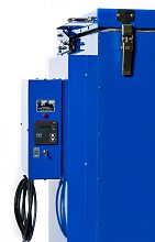 The welding flux temperature inside the oven is regulated and controlled by a field-adjustable, digital controller with bright, LED temperature indicating display (user can switch from Celsius and Fahrenheit). This microprocessor is housed in a control box on the side of the flux oven hopper, along with a separate on/off indicating red light. This light enables users to quickly view from a distance if the oven is receiving power or has been shut off.