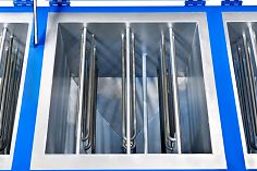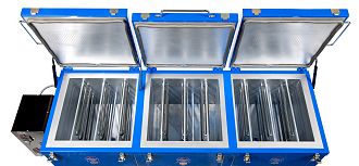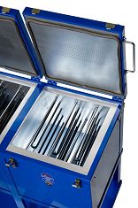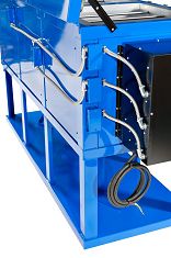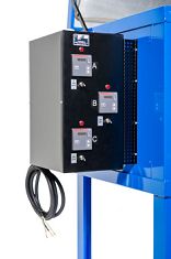 The welding flux temperature inside each hopper is regulated and controlled by three, field-adjustable, digital controllers with bright, LED temperature indicating displays (user can switch from Celsius and Fahrenheit). These microprocessors are housed in a control box on the side of the unit along with a separate on/off indicating red light for each hopper. This light enables users to quickly view from a distance if each hopper is receiving power or if any have been shut off.